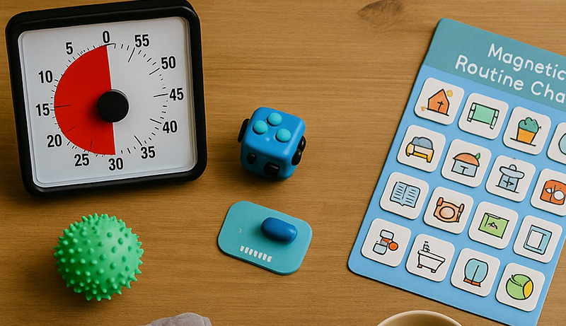 Outils : • routines illustrées, • tableau de progression, • plan de tâches découpées. |